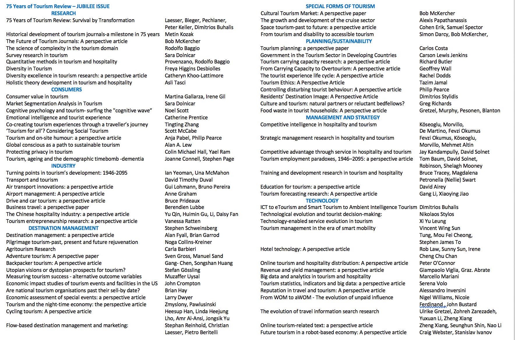 Laesser, C., Bieger, T., Pechlaner, H., Keller, P. and Buhalis, D. (2020), "75 years of Tourism Review: survival by transformation: a perspective article", Tourism Review, Vol.75(1), https://doi.org/10.1108/TR-02-2019-0069