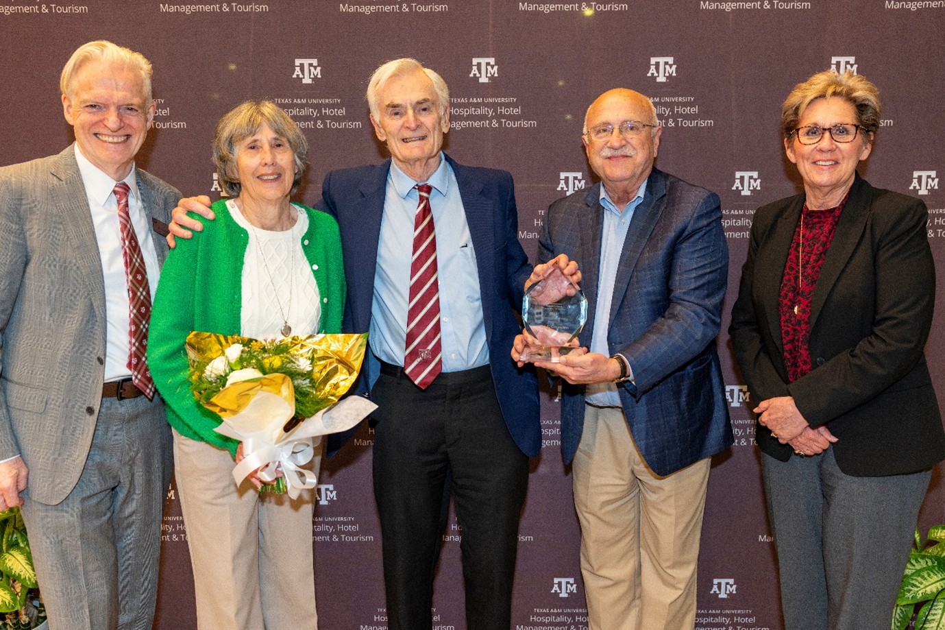 Dr. Jeffrey Savell (Vice Chancellor and Dean for Agriculture and Life Sciences, Texas A&M University) presents Dr. John Crompton with the 2025 HMGT Lifetime Achievement Award in recognition of his 50 years of dedicated service to Texas A&M University. Also in the photograph are (left to right) Dr. King (Department Head of the Department of Hospitality, Hotel Management & Tourism), Mrs Elizabeth Crompton and Dr. Patricia Klein (Executive Associate Dean of the College of Agriculture & Life Sciences).
